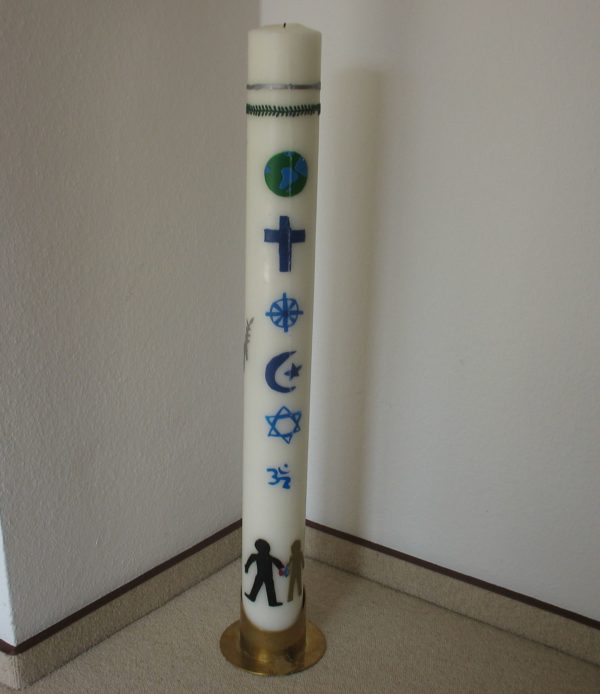 Um den Weg dieser Menschen bildlich auf der Kerze darstellen zu können, orientierten sie sich an dem Vers: „Du führst mich hinaus ins Weite, du machst meine Finsternis hell.“ Die beiden Menschen, dunkel und hell, sollen diesen Weg aus der Finsternis symbolisieren. Ebenso die Verantwortung der Weltreligionen, die mit ihren Symbolen vertreten sind.